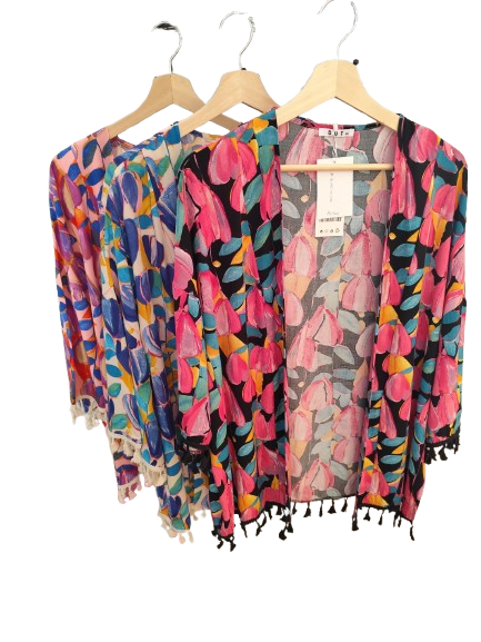 Kimono cómodo y de tacto suave, corto, con estampado floral y borlas colgando en el bajo. Manga tres cuartos amplia. Tres colores: fucsia, lila y rosa