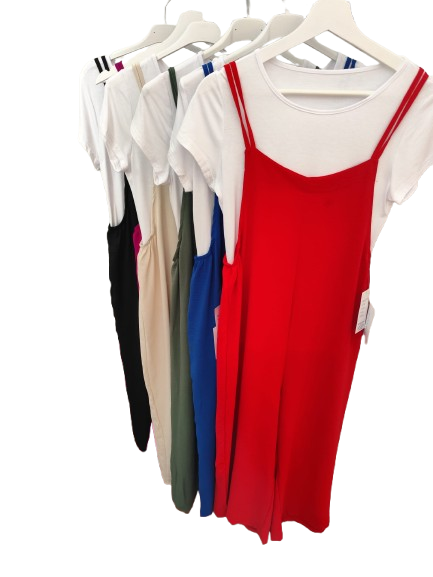 Pantalón amplio semipalazzo, con bolsillos exteriores. Incorpora una camiseta blanca, de manga corta y cuello redondo.