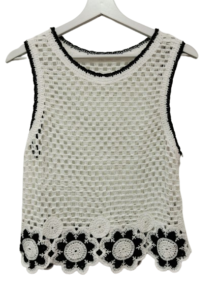 Chaleco o camiseta de punto de ganchillo croché, en blanco con detalle de flores negras. Al ser calado puedes ponértelo encima de una blusa o un top. Es muy versátil para dar originalidad a tus combinaciones.