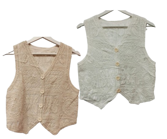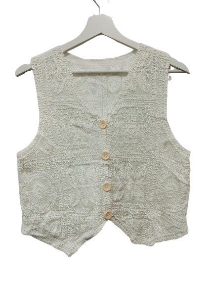 • Chaleco abotonado, estilo blusa boho-chic con croché en blanco