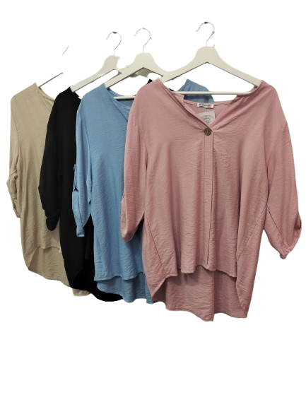 Blusa abotonada evasé con cuello en V y un botón, de manga larga recogida. De tacto agradable, puedes escoger entre estos colores: beige, negro, azul cielo, o rosa