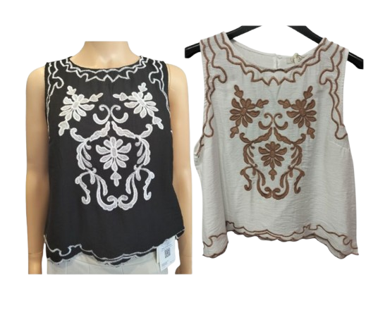 Blusa de tirante ancho con un estampado bordado delantero, tipo Paisley con aire vintage.