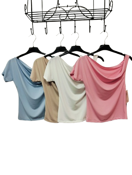 Blusa corta que combina manga corta en un lado y tirante en el otro. Con cuello holgado.