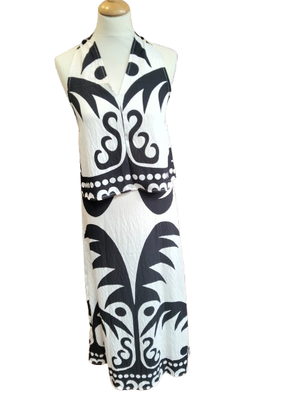 Blusa anudada al cuello con un sofisticado estampado blanco y negro. Estilo que envuelve tu elegancia.