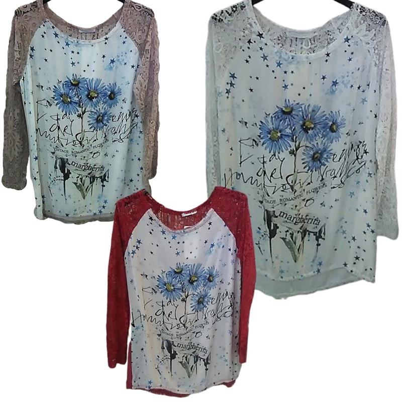 Original  camiseta, de manga larga 3/4 calada, con las mangas de blonda, en color blanco, o malva o rojo. Toque extremado para un estilo casual.