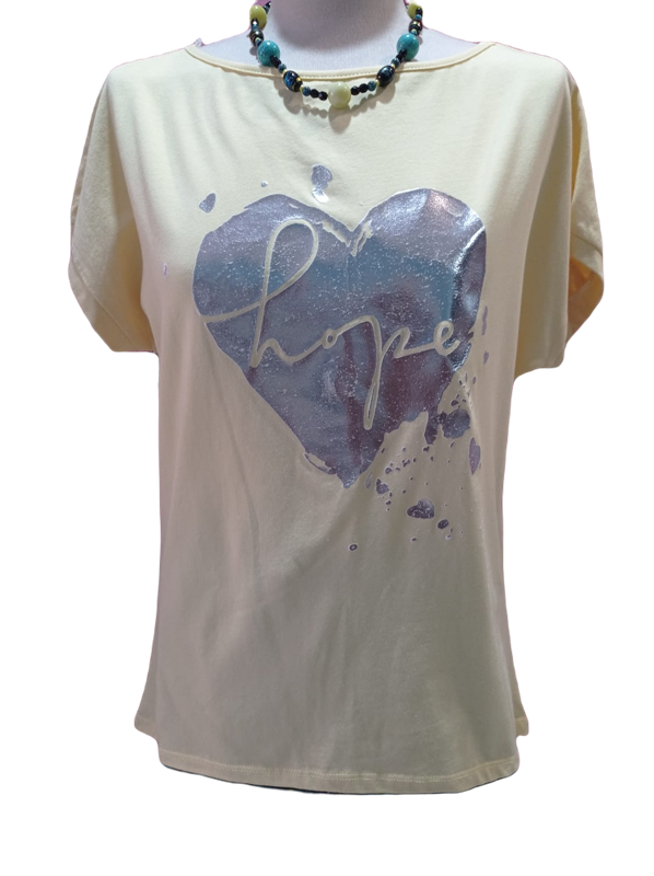 Camiseta de algodón amarilla de manga corta con dibujo de corazón plateado, en la parte delantera. Es holgada para los amantes de corte oversize.
