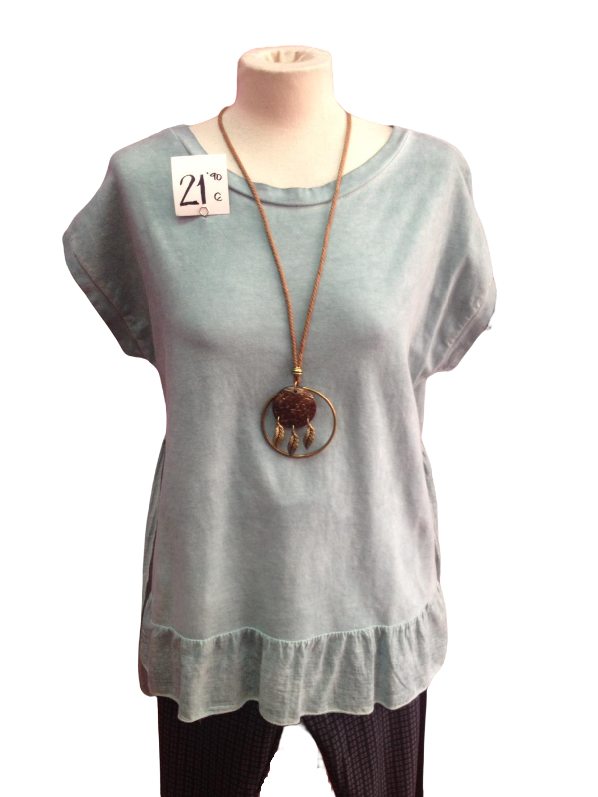 Blusón camiseta de manga corta 100% algodón, con detalle en el bajo de un volante de blonda. Talla única válida hasta talla L (contorno de pecho 100 cm). Largo delante 63 cm, detrás 73 cm