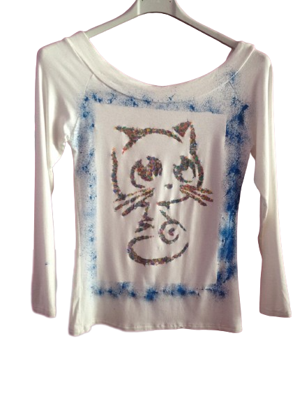 Camiseta de manga larga, cuello semibarco desbocado, con dibujo de gato enmarcado. Forma parte de la colección de edición limitada "Happy".