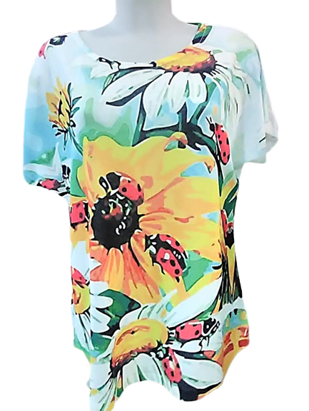 Espectacular camiseta de manga corta con flores grandes, y mariquitas rojas. Extremada para dar un toque original a tu outfit casual. Desigual largo de caderas.