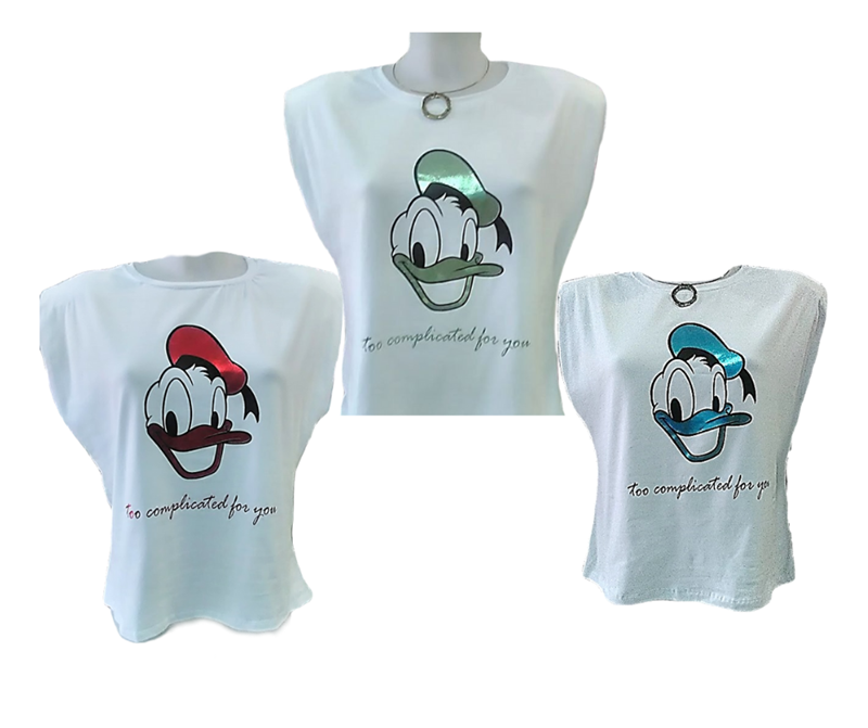 Camiseta de algodón, blanca con hombreras, manga inspiración japonesa.  El sombrero del Pato Donald es el que da color a la camiseta.