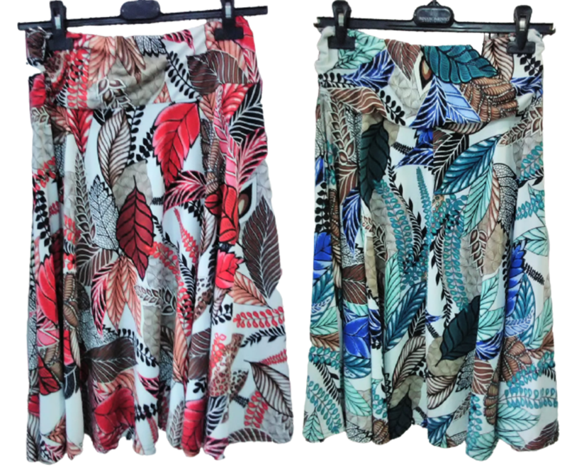 Falda evasé con hojas, ligera, fresquita y veraniega. La cintura es elástica por lo que es adaptable a tallas desde la S hasta XL (para cinturas entre 66 cm y 86 cm)