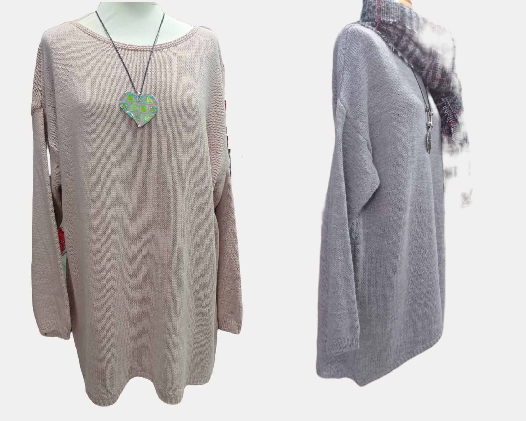 Vestido de punto holgado, cuello barco, bajo irregular, oversize. Si te gusta ir holgada y los jerseys lisos, este vestido es ideal para tu colección de ropa. Disponible en gris y en rosa. Compleméntalo con bisutería, pashminas y cinturón para marcar cintura.