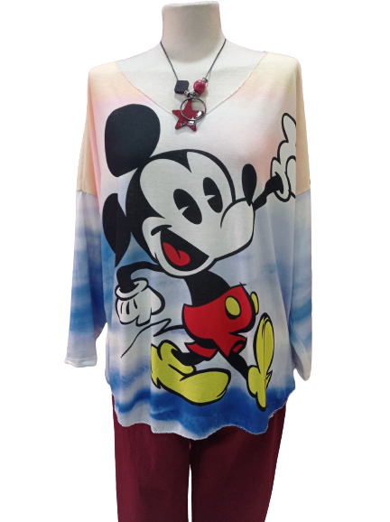 Camiseta de manga larga, con el dibujo de Mickey sobre fondo rosa y azul. Estilo casual y elegante, para llevar con legging o jeans. Es una talla grande o bien oversize. Interesante largo para cubrir la cadera, seguro que te gusta.