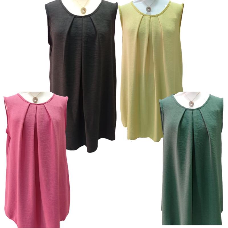 Blusa sin mangas de cuello redondo, con pliegue sugerido delantero. Evase para difuminar la cadera. Disponible en 4 colores: negro, verde botella, coral intenso y mostaza.