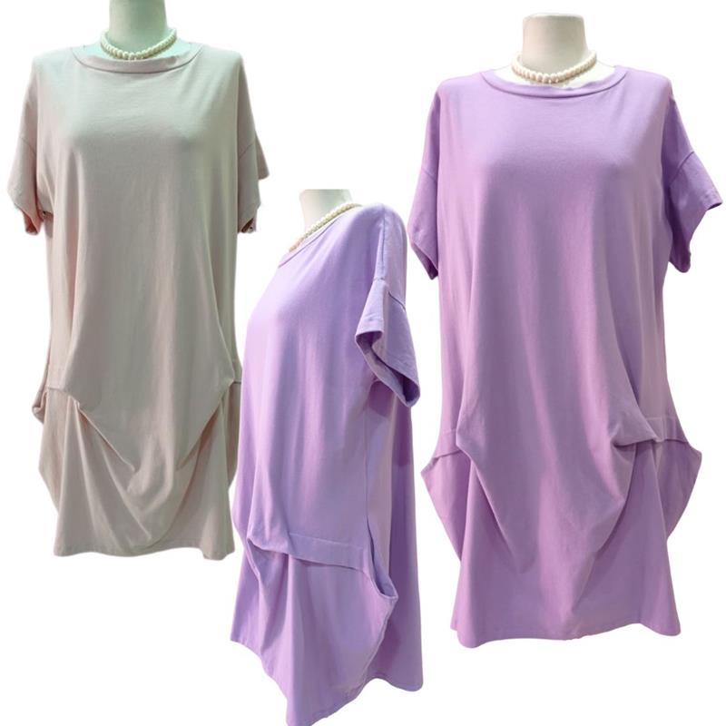 Vestido básico evasé, de algodón, con bolsillos, colores lisos, con fruncido irregular en la falda.  Outfit casual, original base para dar un toque extremado con complementos de collar y pashmina. Disponible en dos colores: malva y rosa palo.