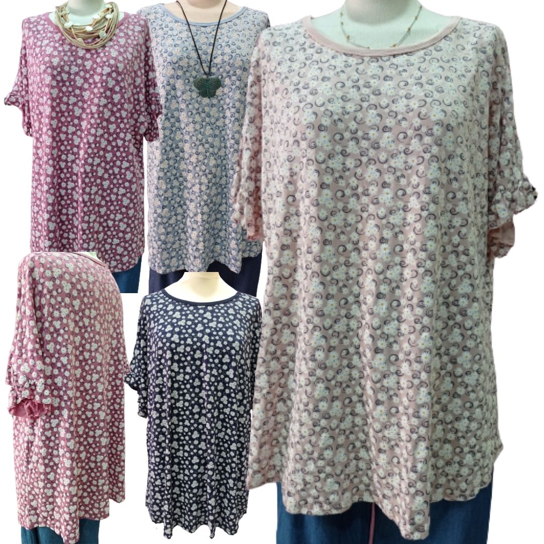 Estampada. Cuello redondo. Manga corta. Talla única (contorno de pecho 130 cm). Largo 72 cm. Evase cadera: 140 cm. Tres colores