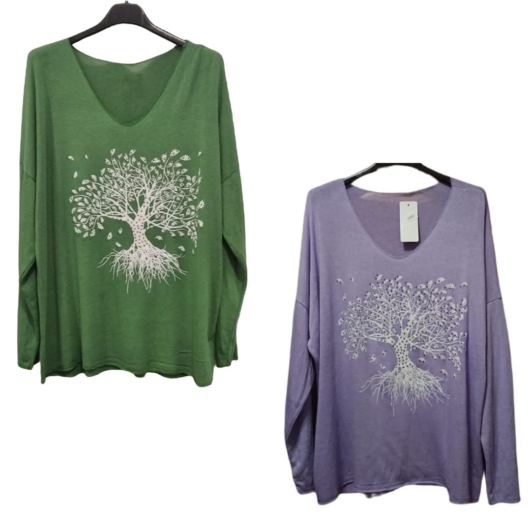 Camiseta de manga larga con cuello en "uve" y árbol de la vida en blanco. Disponible en dos colores: lila y en verde.