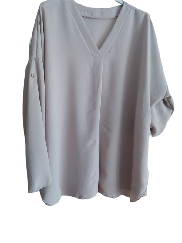 Blusón amplio, con cuello en V y evasé (156 cm). Es de color beig y amplio, ideal para ir con pantalones rectos. Largo 74 cm