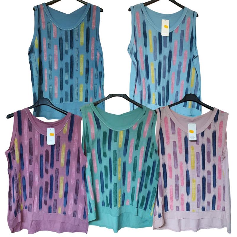 Original blusa de algodón, fresquita y cómoda, sin mangas, tirantes amplios y cuello redondo, con dibujo de rayas verticales intermitentes. Disponible en varios colores: rosa-malva, burdeos, azul cielo, azul cielo fuerte, y verde agua.