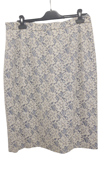 Falda lisa y recta, de fondo azul claro con encajes que la cubren en color blanco. Larga por debajo de las rodillas.