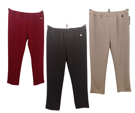 Pantalon liso en varios colores, beige, rojo y negro. Con cintura elástica y tejido deformable tiene una gran versatilidad en las tallas (de la 46 a la 54).
