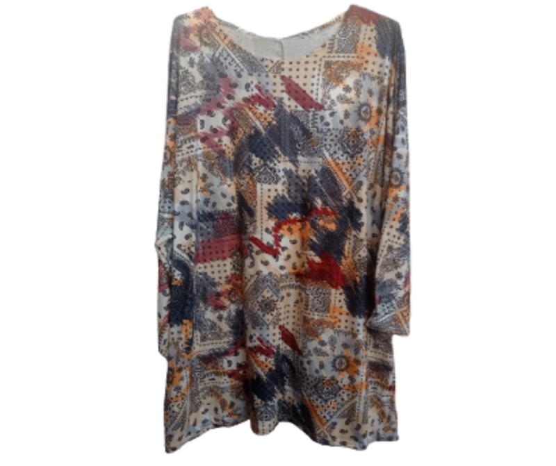 Camiseta blusón evasé, de manga larga con estampado original y abstracto. Deja la monotonía de lado y destaca de forma desenfadada. Contorno de cadera 150 cm. Largo 80 cm. Contorno manga 52 cm.
