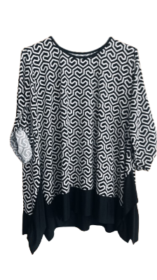 Blusón amplio evasé irregular estampado en forma de laberinto, en talla grande, con manga larga recogida. Diseño cautivador, con estilo y elegancia. Medias: Contorno de pecho 124 cm. Contorno de cadera 164 cm. Largo 78 cm. Contorno manga 50 cm.