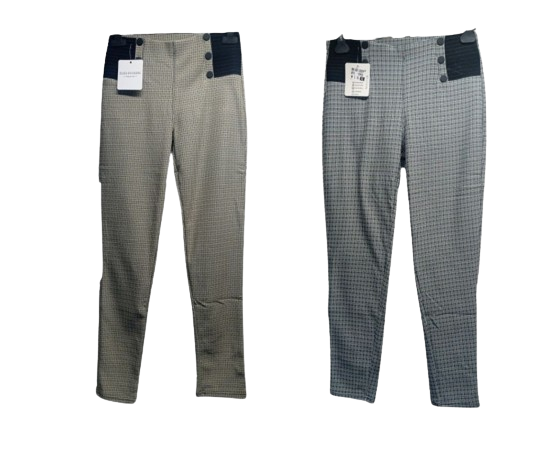 Pantalón - leggin ajustado, elástico para adaptarse a varias tallas. Con estampado de cuadros en colores pastel verde y azul. Decorado con botones. Bolsillos traseros.