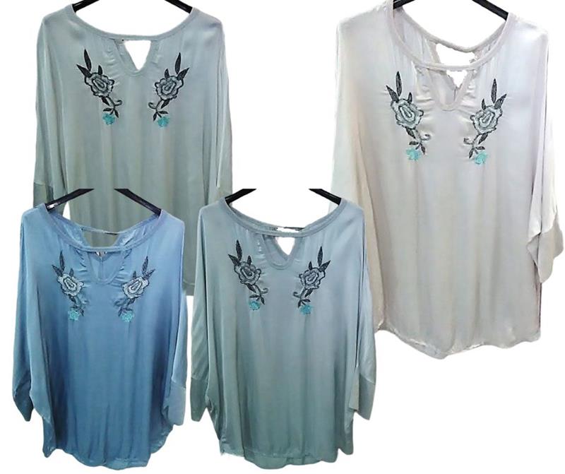 Blusón con flores en V en escote, estilo casual hippy, inspiración boho-chic, disponible en distintos colores rosado, blanco, azul, gris perla. Es amplio, estilo oversize, válido también para tallas grandes.