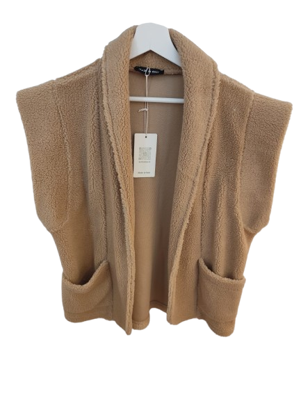 Cálido y original chaleco de color beige, con bolsillos y cuello elevado que da diferentes opciones: cuello smoking, cuello elevado, para cubrir tu cuello y dar calidez en invierno o incluso en el frescor de la primavera incipiente o frescura veraniega.
