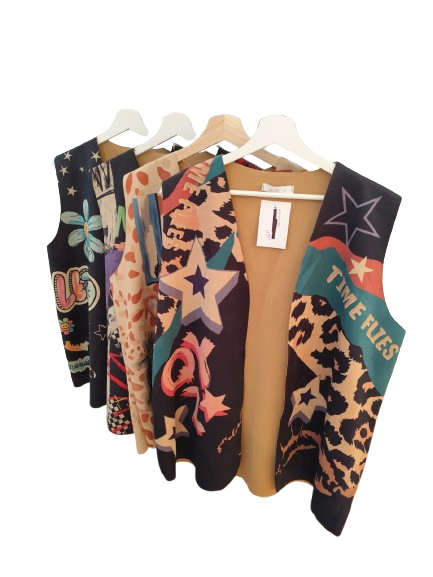 Chaleco de tacto agradable amplio y cómodo, con variedad de dibujos sobre fondo negro y marrón teja. Complementan tus outfits casuales y originales. El modelo no dispone de bolsillos ni botones.