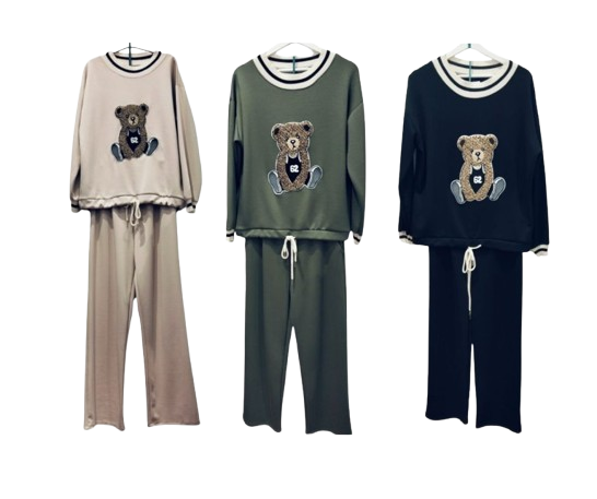 Conjunto deportivo pantalón y sudadera de cuello redondo, cálido y cómodo. Tiene un oso en relieve en la parte central delantera. Escoge verde militar, negro o beige.